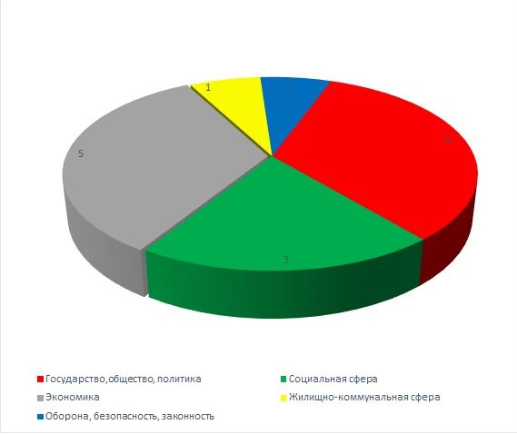 Согласно тематическому классификатору указанные обращения распределились следующим образом: экономика – 5 (33,33 %); государство, общество, политика – 5 (33,33 %); социальная сфера – 3 (20 %), жилищно-коммунальная сфера – 1 (06,67 %); оборона, безопасность, законность – 1 (06,67 %).