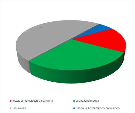 Согласно тематическому классификатору указанные обращения распределились следующим образом: экономика – 9 (50 %); социальная сфера –5 (27,78 %); государство, общество, политика – 3 (16,67 %); оборона, безопасность, законность – 1 (5,55 %).